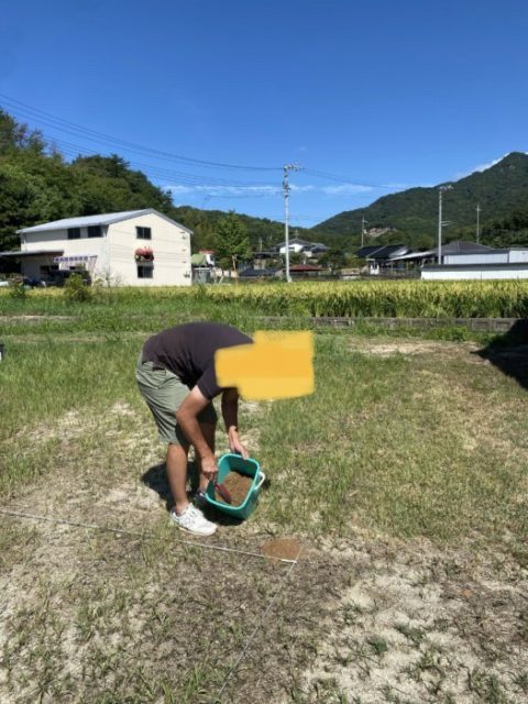 これから、安全に工事が進むようにと祈願しながら、敷地の四隅にと真ん中に土を戻します。