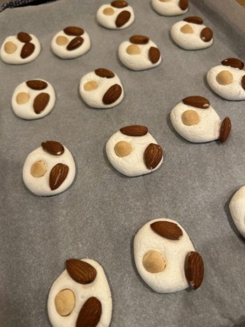 オーブンで柔らかくなるまで温めたマシュマロにアーモンドとボーロをトッピングして、またオーブンでじっくり焼き上げます❗️