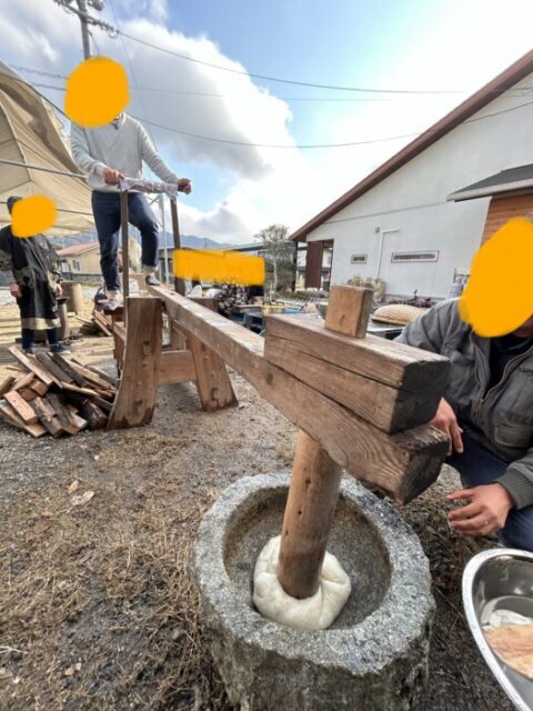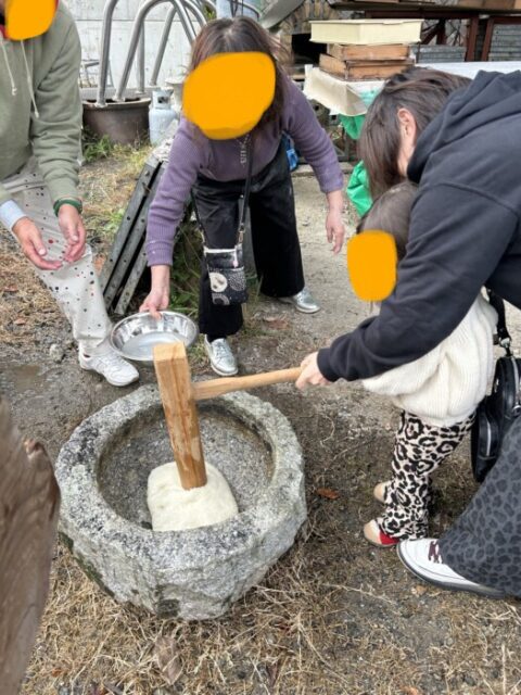 昔ながらの道具、杵を使っての餅つきや【だいがら】での餅つきもチャレンジしました❗️